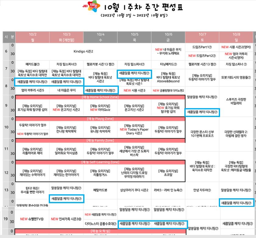 본방 사수를 못한 어린이들을 위해 재능 TV에서는 매일 재방송을 해주고 있습니다. 새콤달콤 캐치티니핑 재방송 편성표는 재능 TV 사이트에서 확인할 수 있습니다. 주간 편성표의 경우 1주일 단위로 업데이트가 되고 있으며 24시 방송이 되는 만큼 거의 모든 프로그램의 재방송을 상영하고 있습니다.