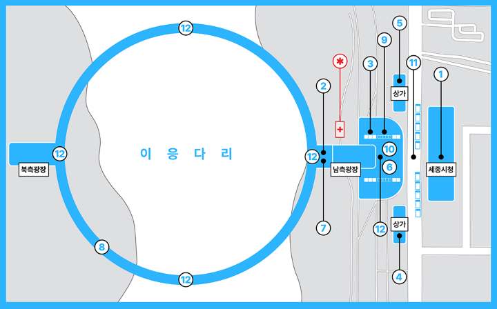 세종 빛 축제 행사장의 구조는 아래와 같으며 총 12개의 구역으로 구분되어 있습니다. 각 구역의 설명은 그림아래 적어 놨으니 확인하시고 필요한 곳으로 찾아가시면 됩니다.
